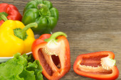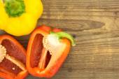 Świeży papryka w wiklinowym koszyku, na drewnianej powierzchni.