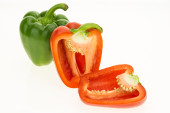 Świeża papryka, jedna pocięta na pół, odizolowana na białym tle.