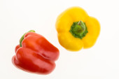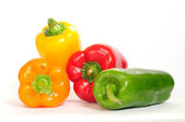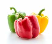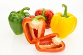 Świeży zielony, żółty i cięte w dwóch czerwonych papryki, izolowane na białym tle.