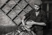 Fryzjer Nożyce do klienta. Fryzjer pracuje na sposób klient.