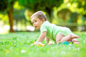dziecko dziewczynka uczenia się czołgać w trawie park