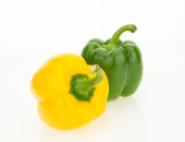 Świeża żółta i zielona papryka, na powierzchni drewnianej.