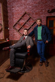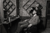 Fryzjer Nożyce do klienta. Fryzjer pracuje na sposób klient.