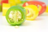 Świeży papryka w plasterkach na pierścionki, izolowane na białym