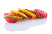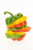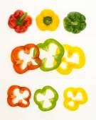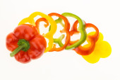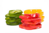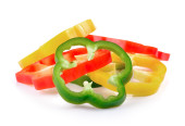 Świeży papryka w plasterkach kolorowe pierścienie, izolowane na białym tle.