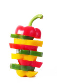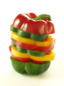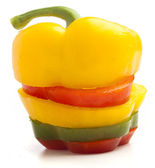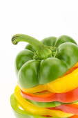 Świeży papryka w plasterkach kolorowe pierścienie zbliżenie, izolowane na białym tle.