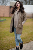 Zdjęcie "Wiosna w stylu country. Pełnej długości piękny portret młodej kobiety w biały sweter z dzianiny i futrzany kapelusz stojący przed rustykalnym drewna ściany w stoczni w pobliżu domu, noszenie sweter dorywczo." może być wykorzystywane do celów osobistych i komercyjnych zgodnie z warunkami zakupionej licencji Royalty-free. Obraz jest dostępny do pobrania w jakości wysokiej rozdzielczości do 5760x3840.