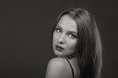 Piękne, tajemnicze, ładny brunetka na ciemnym tle. Czarno-białe zdjęcie piękne tajemnicza brunetka.