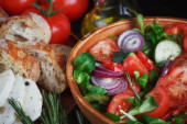 Całe ziarna zbóż pieczywa chrupkiego, serek, koperek i pomidory