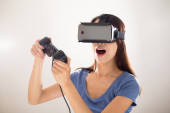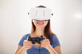 Zdjęcie "Kobieta z wirtualnej rzeczywistości urządzenia" może być wykorzystywane do celów osobistych i komercyjnych zgodnie z warunkami zakupionej licencji Royalty-free. Obraz jest dostępny do pobrania w jakości wysokiej rozdzielczości do 5760x3840.