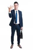 Sprzedaży człowiek stojący gospodarstwa teczki i wyświetlone numer trzy