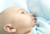 piękne małe dziecko z wielkie oczy w biały ręcznik patrząc pod kątem coś