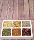 Przyprawy i zioła w słoikach. Jedzenie, kuchnia składników. Deska drewniana