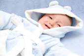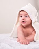 piękne małe dziecko z wielkie oczy w biały ręcznik patrząc na kamery