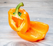 Pomarańczowy papryka (pieprz) na białym tle drewniane