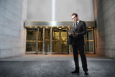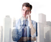 uśmiechający się młody biznesmen, patrząc na jego zegarek z gród w tle
