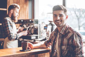 Barista w fartuch w kawiarni