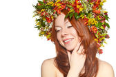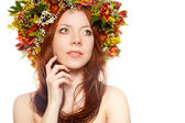 czerwone włosy szczęśliwą kobietą z wieniec z kwiatów na głowie