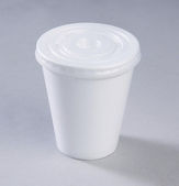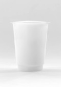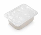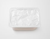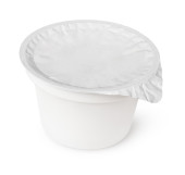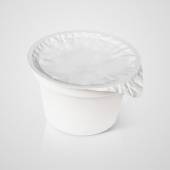 Biały plastikowy pojemnik na produkty mleczne z pokrywką folii