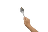 Męskiej ręki trzymającej pusty łyżka, skład na białym tle