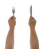 Widelec i łyżka posiadanych przez ręce mężczyzna na białym tle