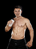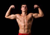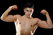 przystojny sport mężczyzna pozowanie z silnym nagi tors Szukam koncepcji fajne niepokorny dopasowanie do ciała