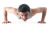 young tired sport man with athletic fit body holding towel and water bottle in exhausted face expression