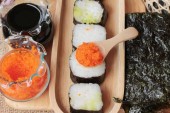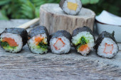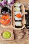 Roll sushi z wodorostów sałatka i krewetki jaj