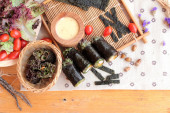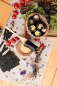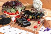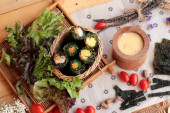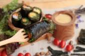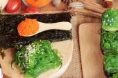 Zdjęcie "Roll sushi z wodorostów sałatka i krewetki jaj" może być wykorzystywane do celów osobistych i komercyjnych zgodnie z warunkami zakupionej licencji Royalty-free. Obraz jest dostępny do pobrania w jakości wysokiej rozdzielczości do 5760x3840.