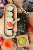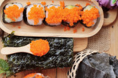 Zdjęcie "Roll sushi z wodorostów sałatka i krewetki jaj" może być wykorzystywane do celów osobistych i komercyjnych zgodnie z warunkami zakupionej licencji Royalty-free. Obraz jest dostępny do pobrania w jakości wysokiej rozdzielczości do 5760x3840.