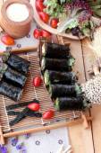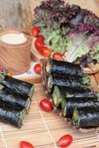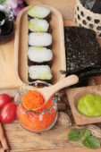 Roll sushi z wodorostów sałatka i krewetki jaj