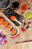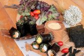 Roll sushi z wodorostów sałatka i krewetki jaj