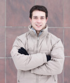 Kurtka na zewnątrz zima, pomysł koncepcji szczęśliwy osoba pewność, moda styl życia szczegół facet street, spaceru weekend