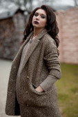 Zdjęcie "Wiosna w stylu country. Pełnej długości piękny portret młodej kobiety w biały sweter z dzianiny i futrzany kapelusz stojący przed rustykalnym drewna ściany w stoczni w pobliżu domu, noszenie sweter dorywczo." może być wykorzystywane do celów osobistych i komercyjnych zgodnie z warunkami zakupionej licencji Royalty-free. Obraz jest dostępny do pobrania w jakości wysokiej rozdzielczości do 5760x3840.