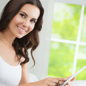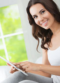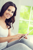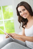 młoda kobieta w domu przy użyciu komputera typu tablet,