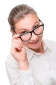 zamyślony kobieta na białym tle na białym tle okulary