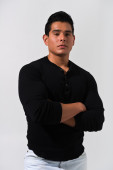 atrakcyjny Sport Człowiek z dużym silnym atletyczny ciało stwarzające z składane ramiona patrząc szczęśliwy uśmiechnięty