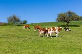 Szwajcarski krów na łące, Aargau, Szwajcaria