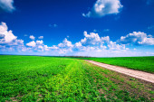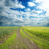 brudny drogi w pobliżu zielone i czarne pole pod pochmurnego nieba