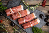 Antipasto catering talerz z salami i mięsa na tle drewniane