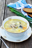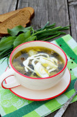 Zupa z kluskami i mięsa na drewnianym stole, selektywne focus.