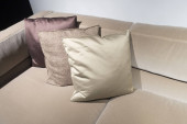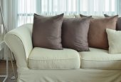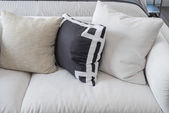 Solidne brązowe tweed sofa z szarym wzorzyste poduszki