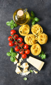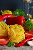 surowy makaron z pomidorami i papryką na czarnym tle