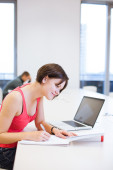 w bibliotece - bardzo kobiece studenta z laptopa i książek