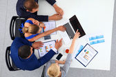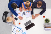 Biznesmeni siedzący i dyskutujący na spotkaniu biznesowym, w biurze