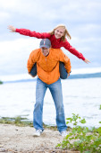 para młoda miłość uśmiechający się pod błękitne niebo