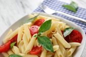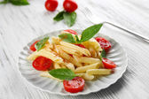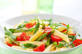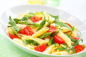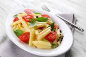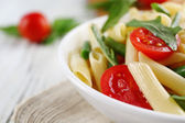 Gotowany makaron penne z pomidorów, fasoli francuskiej i rukolą na białym talerzu