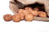 Wylewa z worka nie jest obrane orzechy włoskie na białym tle
