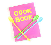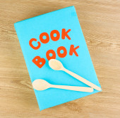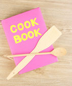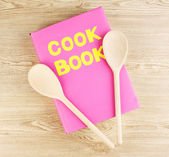 naczynia kuchenne na drewniane tła i książka kucharska
