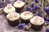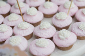 Batonika. Taca z pyszne ciasta. Elegancki stół słodki z duże ciasta, babeczki, ciasta wyskakuje na kolację lub zdarzenia strony. Lizaki. Fioletowy i biały